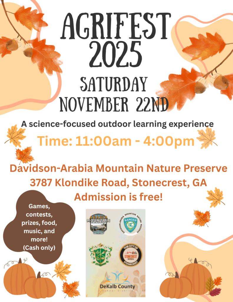 Arabia Mountain High School’s Earth Tomorrow Club presents AgriFest 2025! Enjoy this science-and-nature based outdoor learning experience with lots of fun games, competitions with prizes, tasty food and cool stuff from local vendors! All ages are welcome!