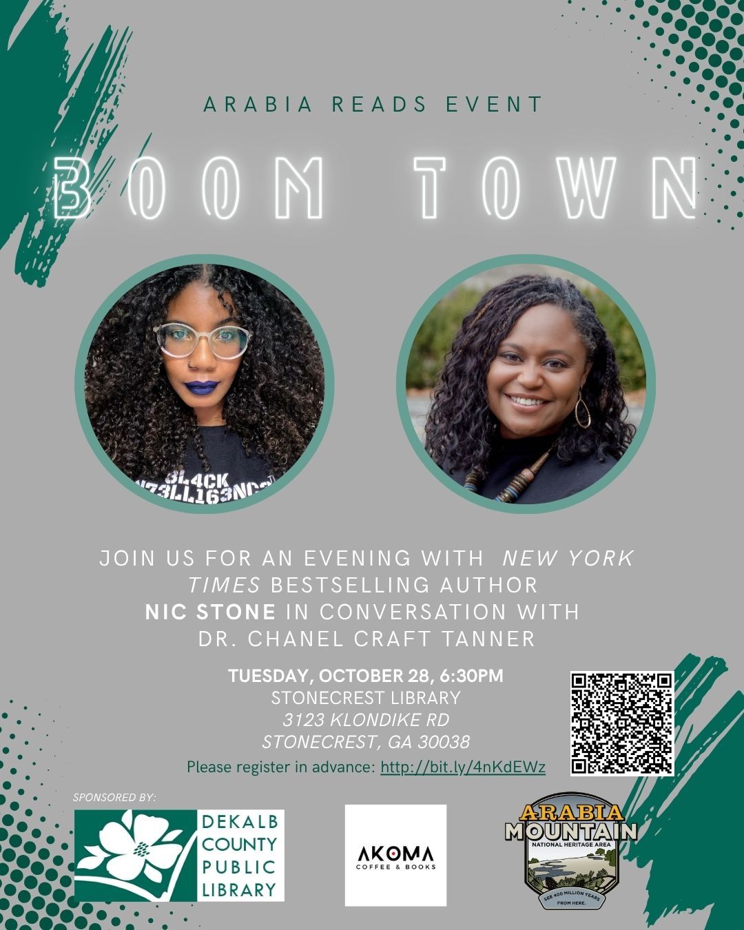 FREEFor National Arts and Humanities Month, the Arabia Alliance is proud to host New York Times bestselling author Nic Stone (writer of the smash hit Dear Martin). Join us for an evening of reading and mingling with Stone at the Stonecrest Library on October 28 from 6:30 to 8pm. Stone will be reading from her new debut work of adult fiction called Boom Town, a thriller-meets-noir about Atlanta’s hottest Black strip club and a pattern of erotic dancers gone missing. She will also be in conversation with Dr. Chanel Craft Tanner, Director of the Women’s Center at the University of Virginia. Don’t miss this opportunity to hear from one of Atlanta’s most renowned authors!
